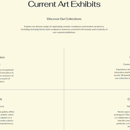 The About page tells the story of the gallery, detailing its history, vision, and values. It introduces the artists and their expertise, offering visitors a deeper connection to the artwork. The design is elegant and sophisticated, with an emphasis on typography and calming colors, allowing the focus to remain on the content. This page also highlights the craftsmanship of the gallery’s offerings, with a behind-the-scenes look at the creative process behind the acrylic paintings and sculptures.