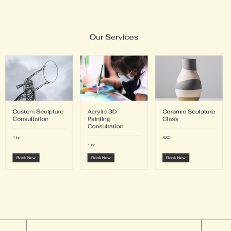 The Book Online page allows users to book sculpting classes or private viewings directly from the website. It features a clean and intuitive booking system, allowing users to select available time slots, enter their information, and receive confirmation via email. This page offers a seamless booking experience with real-time availability updates, making it easy for visitors to schedule one-hour sculpting classes or private consultations without friction.